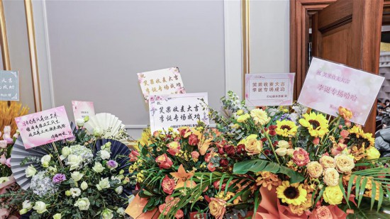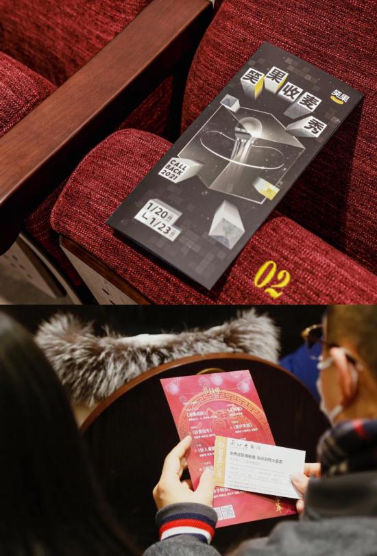 祝賀花籃滿滿當當,從蘭心大戲院前廳一直“擠”到側門。與大多數演出的祝賀花籃統一形制不同,“笑果收麥秀”收到花籃從鮮花種類、顏色、造型到立牌字體五花八門。穿著時髦的觀眾第一次走進修繕后的蘭心大戲院,他們在前廳留影,舉起票根對著舞臺拍照打卡,這些照片不久后出現在微博、豆瓣、小紅書、大麥網、大眾點評,將演出效果放大十倍、百倍。