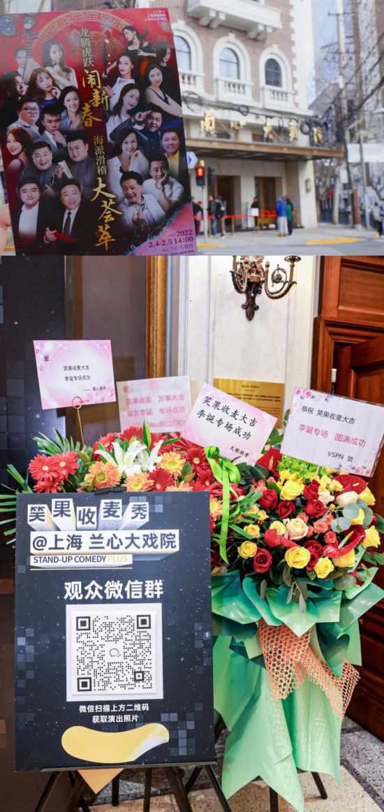 在蘭心大戲院演出,脫口秀演員依舊像在百人小劇場演出,與前排觀眾保持緊密互動,“誰第一次來蘭心?”一大半觀眾舉起了手!奥犝f今天后臺堆了80多個花籃,看來虎年我們得繼續在這里演出!背惕吹脑捵尙F場笑聲四起。當晚“笑果收麥秀”超時近20分鐘才結束。