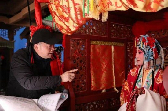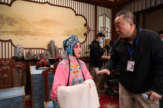 《鎖麟囊》拍攝現場,導演滕俊杰正在向張火丁介紹鏡頭的拍攝景別