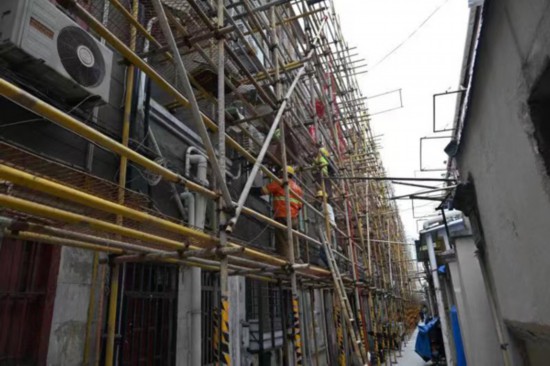 記者今天在里弄里看到,部分房屋的腳手架已經搭建好,工人們正在對房屋修繕。四川北路永安里有住宅155幢,39號-155號為1925年所建,1號-38號為1945年所建,建筑面積約為2.1萬平方米,磚木結構三層房屋,單開間連列式石庫門,具有古典英國式和西班牙式等多種建筑風格。永安里為當時永安公司老板郭氏出資為其公司中高級職員所建。郭氏為廣東籍人,所用職員多為廣東籍人,虹口當時是在上海的廣東人主要聚集地,故郭氏挑選此地為職員宿舍,并取名為永安里。