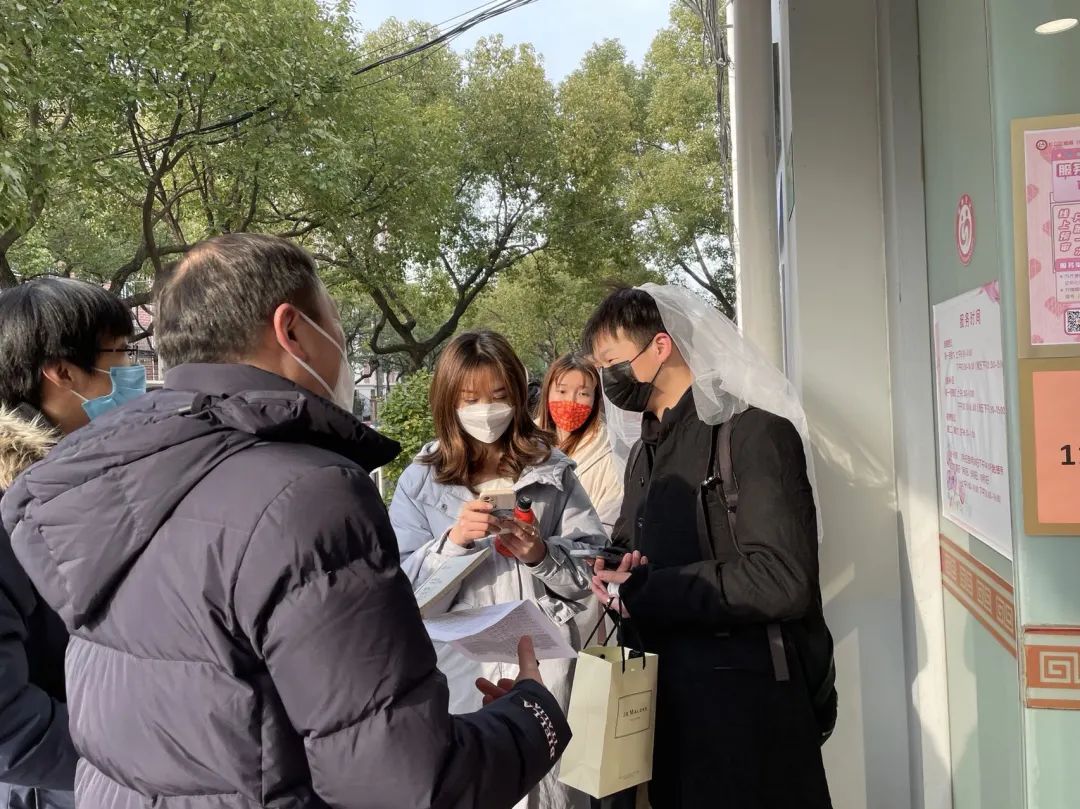 “線上預約過的請走這邊,沒有預約過的我會給你們發號。都不用擔心!”今早8點不到,小虹看見區婚姻登記中心門口已排起了長隊,中心主任杜民拿著筆和本子,為現場排隊的準新人們手動登記排號。