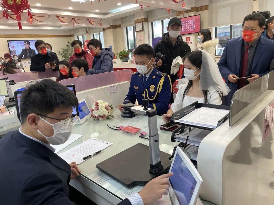 8:26,工作人員打開了婚姻登記中心的大門,線上預約的第一對準新人走了進來。這是一對消防官兵和教師的組合,倆人相戀一年多,認定了彼此,決定在2022年2月22日領取結婚證。為此,準新郎王康超仔細研究了相關預約信息。