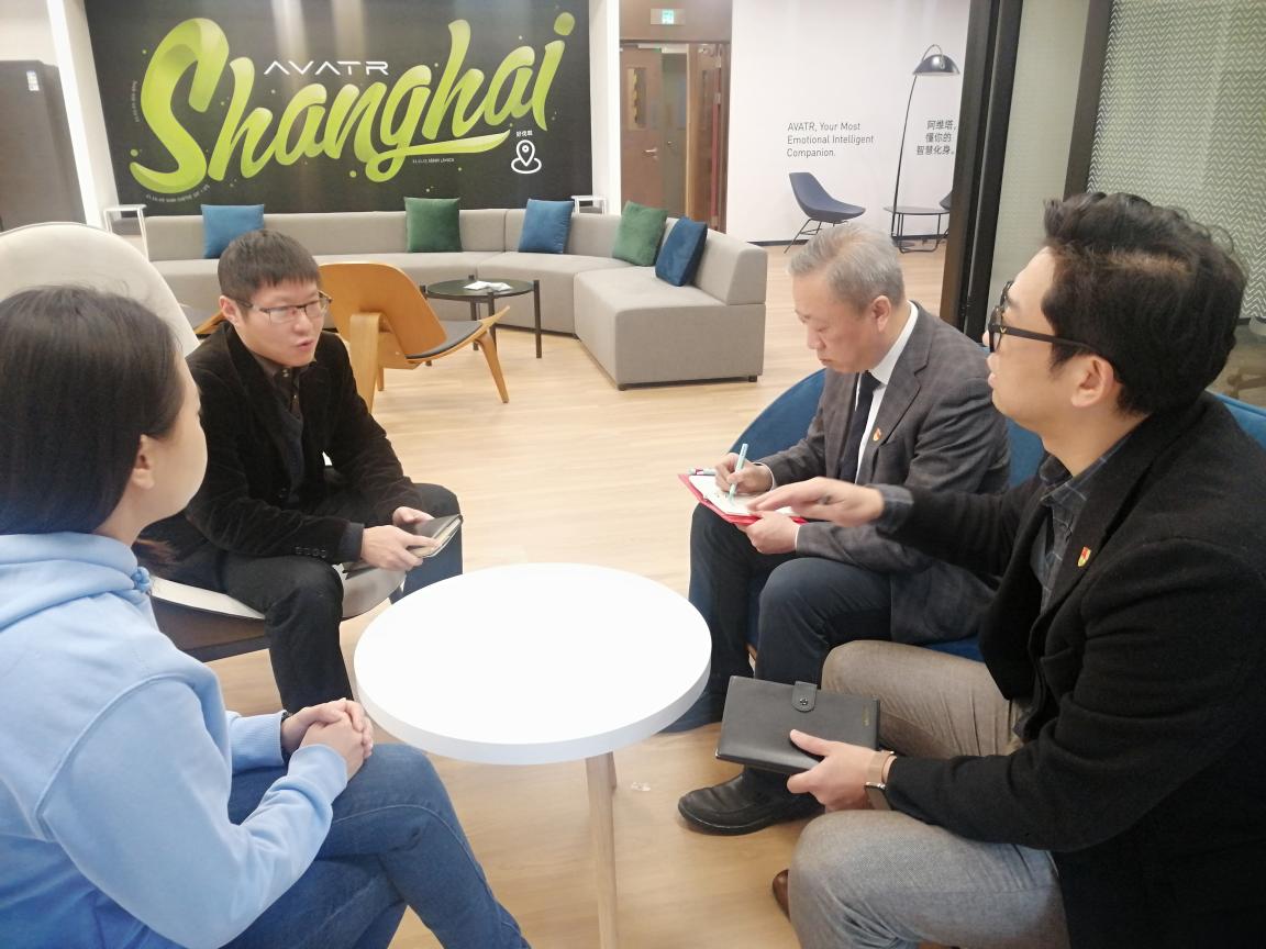 阿維塔政府事務高級經理張亮(左二)向上門走訪的干部反映情況。黃曉慧 攝