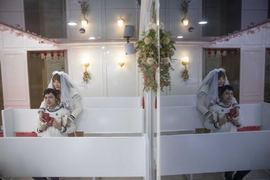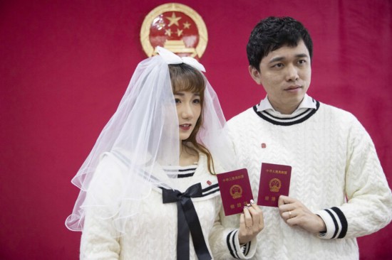 剛剛登記完畢的新人周鑫宇、黃莉在靜安區婚姻登記處拍照留念。