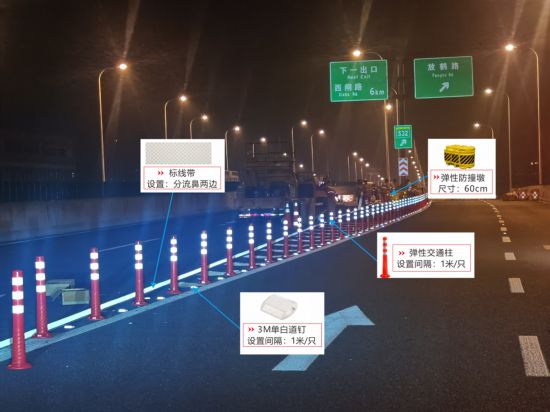 市道運中心聯合交警、養護單位及專業材料公司等,遵循“安全、醒目、耐久、有序”的原則,率先在虹梅南路高架上下匝道、立交及緊急停車帶等位置增設隔離設施警示標識,采取“一預告、二限速、三警示、四容錯”的立體化措施,對匝道口和緊急停車帶進行升級改造,提升道路設施品質,提高設施運維水平。