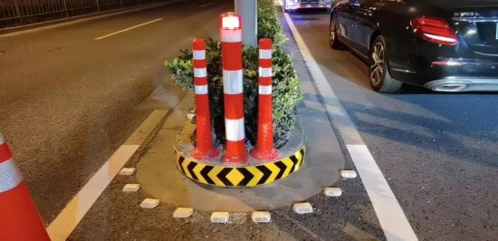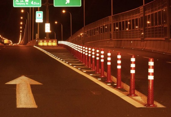 本次虹梅南路高架道路隔離設施警示標識的安裝遵循了綠色低碳、簡約環保、經濟耐久的原則,采用高性能的逆反射材料,選用耐彎折易養護的警示柱,降低維護成本;施工上采用成熟的膠粘方式或膠粘輔助方式,減少對路面的損害;采用全方位立體化設計和施工,警示效果顯著,同步提升了全天候的養護理念。