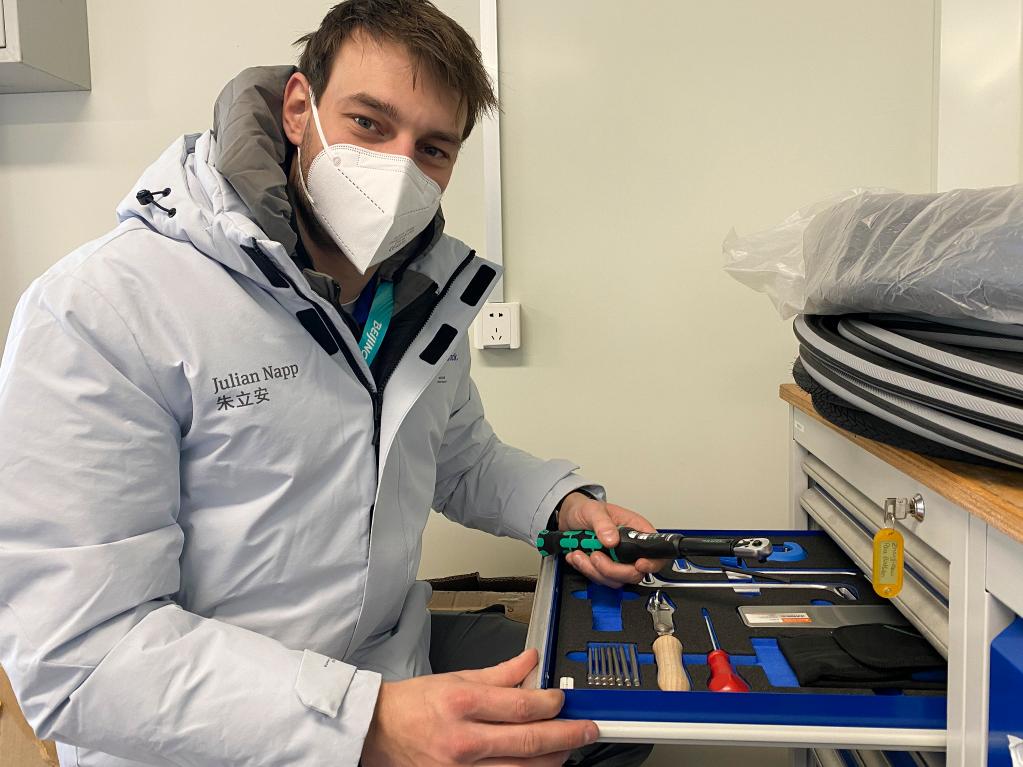 在云頂滑雪公園,矯形器、假肢與輪椅維修中心的維修技術人員朱利安·納普展示工作中需要使用的各類工具。新華社記者許暢攝