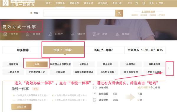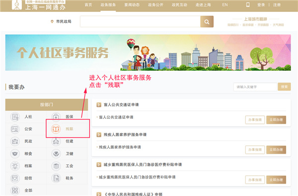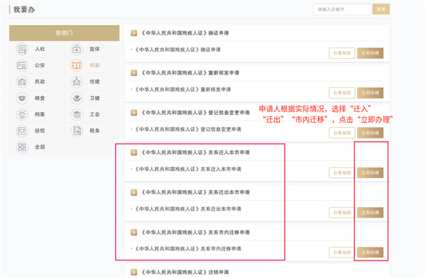 入口2:從“助殘一件事”主題進入辦理“《中華人民共和國殘疾人證》關系遷入本市申請”或“《中華人民共和國殘疾人證》關系市內遷移申請”,也可根據申請人需要同時申請《中華人民共和國殘疾人證》登記信息變更等其他聯辦事項。