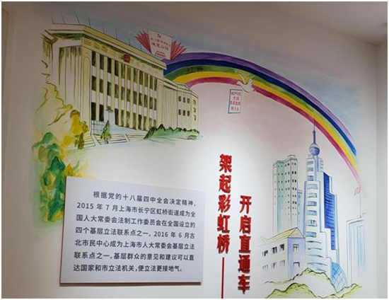 古北市民中心墻上的“彩虹橋”,一頭連著虹橋街道,一頭連著全國人大常委會,一只白鴿銜著一封信從上海飛往北京。