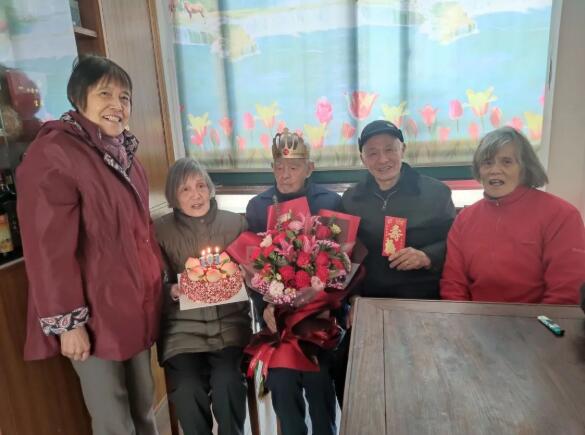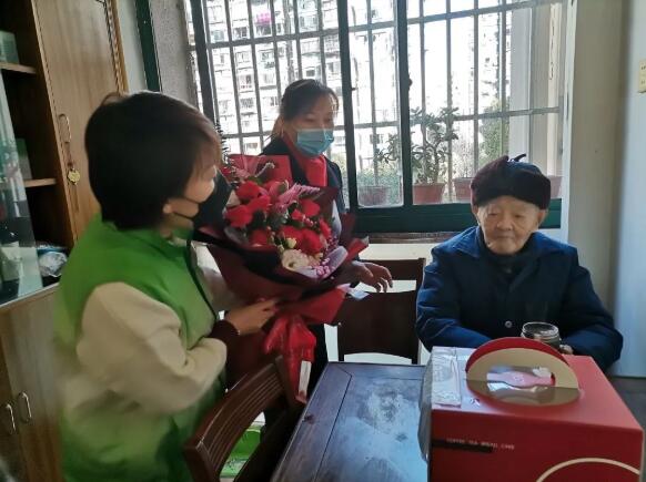 “田爺爺,今天是你的生日,我們特地來祝賀,祝您老人家健康長壽,天天開心!苯,寶山區顧村鎮豐水寶邸的居委工作人員帶著真摯的祝福和慰問,走進百歲老人田榮根家中,為這位老壽星送去生日蛋糕與鮮花,慶祝老人101歲生日。