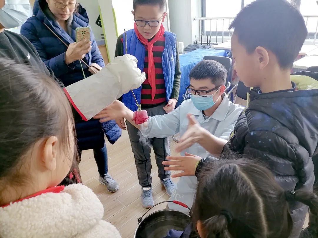 活動開始,科普老師向小朋友們講述了關于液氮的基礎知識。液氮是氮氣在低溫下形成的液體形態,無色、無味、無腐蝕性、不可燃且溫度極低。正在大家好奇之時,老師又展示了精心準備的“魔術”:在液氮的變化之下,活動現場出現了一陣陣繚繞的云霧;接著,一支被放在零下196℃液氮中速凍的紅玫瑰,輕輕一拍,便神奇地碎裂散落……