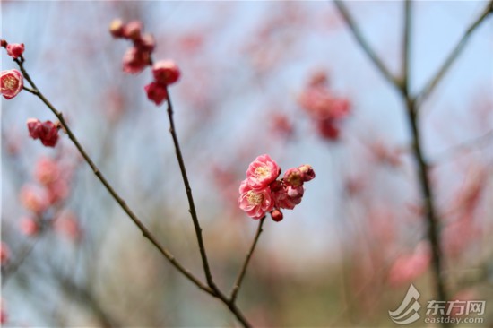 在經歷了3月1日晚間的短時小雨后,上海今天又恢復了晴朗。上海雖然還未宣告正式入春,但天氣比較暖和,風力也不大。大地復蘇,步行在街頭,時常會被腳邊的花草驚艷。在徐匯龍華,一片紅梅林吸引路人目光。