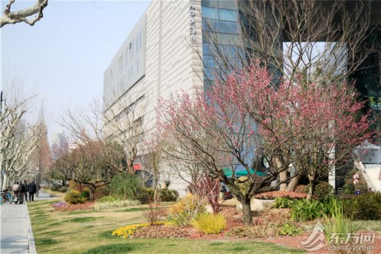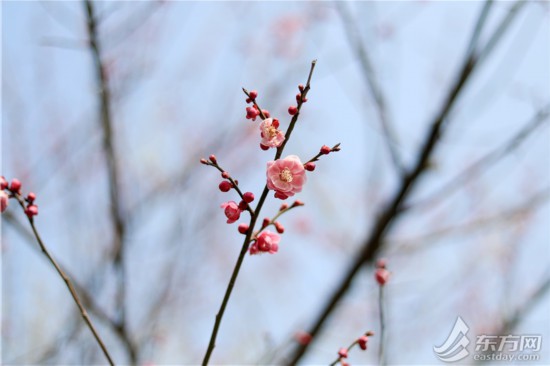 在上海京劇院門口,紅梅在枝頭展露笑顏,一派春日美景。粉色的紅梅層層疊疊綴滿枝頭,近賞嬌羞可愛,遠觀絢麗奪目。