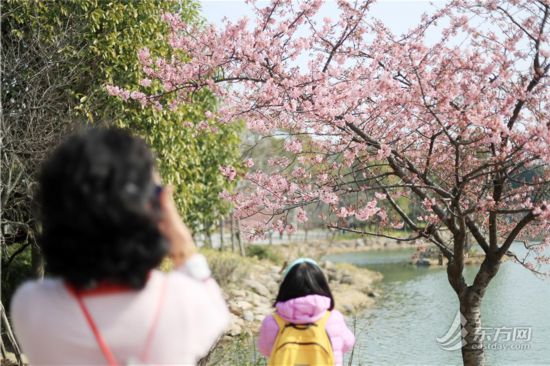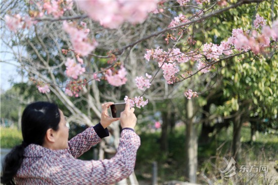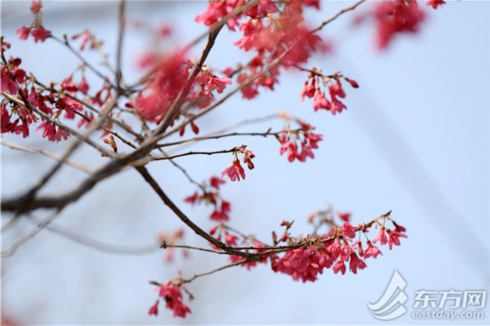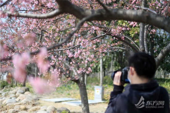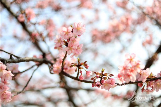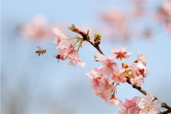東方網記者柏可林3月3日報道:以河津櫻、鐘花櫻為代表的早櫻品種,即將在本周末進入盛花期。3月3日,上海植物園內種植的河津櫻、鐘花櫻當仁不讓占據C位,粉色的花朵在明凈空朗的藍天襯托下更顯瑩然剔透,不僅吸引蜜蜂采蜜,也吸引游客拍照。