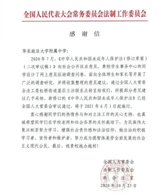 2021年6月1日起施行的新修訂的《未成年人保護法》,其中有一條立法修改意見,也是由華政附中學學生提出的,并被全國人大常委會法工委立法采納。