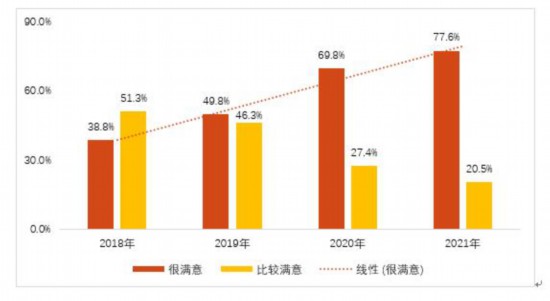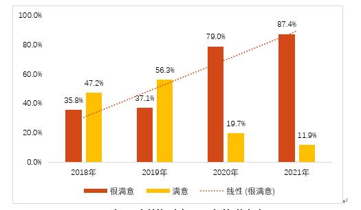 從志愿者對自己過去一年參加志愿服務活動的滿意度來看,有98.1%的志愿者表示滿意,其中,77.6%的志愿者表示“很滿意”,20.5%的志愿者表示“比較滿意”。經對比,在“很滿意”的選擇比例上,每年均有較大幅度的提升,體現出申城的志愿服務工作能級不斷提升,志愿者在參與志愿服務活動時體驗良好。市民對所接受志愿服務的滿意度達到99.3%,其中,市民表示“很滿意”的比例為87.4%,與去年相比呈現較大幅度的提升。