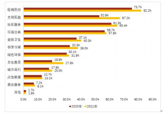 2021年,志愿者積極參與到各類志愿服務項目中,其中排在前三位的是“疫情防控”“文明實踐”和“社區服務”,志愿者的參與比例分別為82.2%、67.2%和65.4%。與2020年相比,志愿者參與“疫情防控”類志愿服務項目的比例連續兩年位列第一,志愿者參與各類志愿服務項目的比例均有一定程度提升。其中,參與“文明實踐”類志愿服務項目的比例上升了14.4個百分點,參與“疫情防控”和“社區服務”類志愿服務項目的比例分別上升了6.5和4.1個百分點。同時,志愿者參與“垃圾分類”“愛國衛生”“鄰里守望”“綠色環!薄皯本仍钡戎驹阜⻊枕椖康谋壤卜定維持在較高水平,體現出志愿服務常態化融入社會治理,服務百姓民生的時代特征。