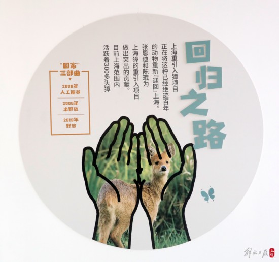 “獐顯不凡”科普館,對麝、獐、麂等動物作了對比介紹,同時詳細介紹了獐這一上!霸∶瘛被貧w歷程。