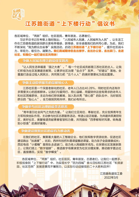 “真誠期待社區各方力量走出樓宇、辦公室、家門,走進社區,一起打造社區共同體!”3月4日上午,江蘇路街道召開“上下樓行動”部署會,將在今年全面推出“上下樓行動”,鞏固深化黨史學習教育常態長效機制,深入推進“我為群眾辦實事”實踐活動,將大走訪、大排查工作具體化,創新發展全過程人民民主和新時代凝聚力工程。