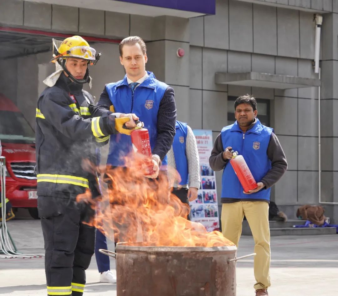 隨后,志愿者們來到長寧區延安消防救援站,穿上消防服、坐上消防車、舉起消防水槍,體驗了一次消防員的日常工作情況。緊接著,他們還參加了油桶滅火實操訓練,在消防救援人員的指導下,用干粉滅火器“提拔握壓”對準火源根部噴射。通過這些沉浸式消防體驗,讓外籍志愿者們可以零距離掌握防災減災知識與滅火自救技能。