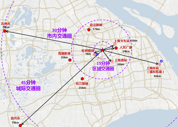 通過道路路網和公共交通的完善,更好發揮虹橋樞紐的對外交通功能,區域對外路程時間將進一步縮短,將形成“3×15”交通圈,即15分鐘可達的區域交通圈、30分鐘可達的市內交通圈、45分鐘可達的城際交通圈。