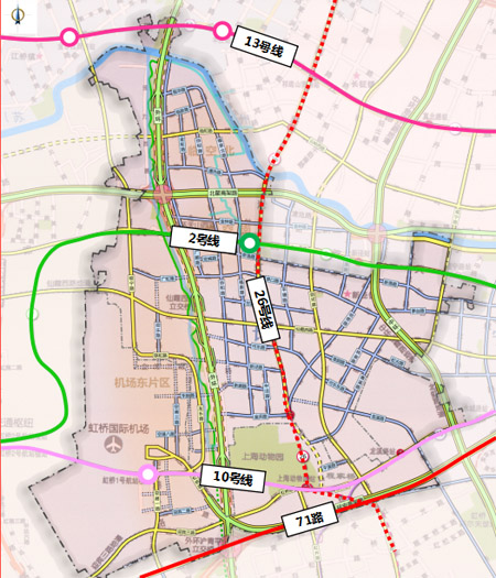 在公共交通方面,東虹橋區域現有2號線、10號線、13號線3條橫向軌交線路,將新增26號線縱向軌交線路,連接現有的3條軌交線和71路公交,共同形成更加完善的公共交通網絡。