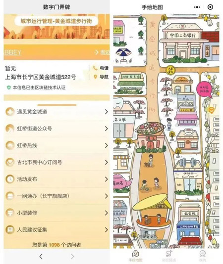 在數字化轉型的大背景下,黃金城道步行街的商戶及公共設施陸續安裝數字門弄牌,將地址和其他屬性的信息生成規范的“身份證”,涵蓋了200個商戶50個公共部件。此外,遇見·黃金城道小程序也在步行街共治委員會的支持下開發上線,在此基礎上拓展了各類新應用,為社區居民提供更智慧更豐富的生活服務。