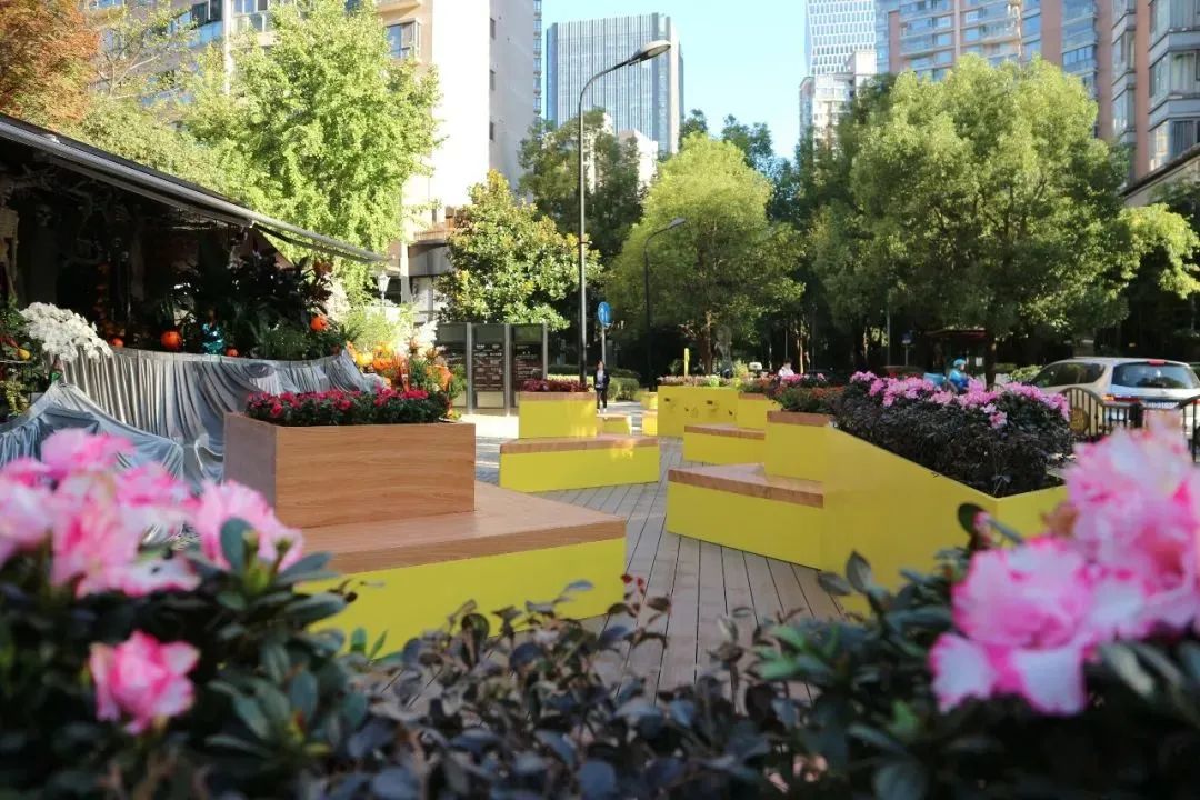 位于黃金城道、瑪瑙路路口的融·阡陌小筑,名字源于《桃花源記》里的“阡陌交通”一詞。這個由黃色多邊形裝置圍合而成的公共空間,一旁還附帶了專供非機動車停放的港灣式停車點,為街區營造了安全、有序的公共空間。