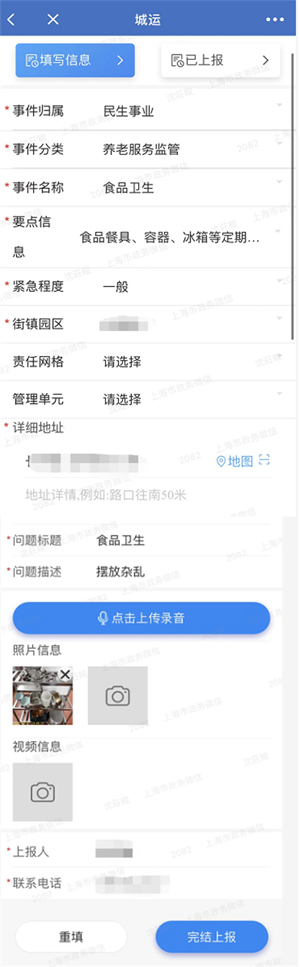 滅火器過期、常閉式消防安全門開啟、廚房餐飲衛生存在隱患……在養老機構的日常自查和監管部門的巡查抽檢中,工作人員一旦發現問題,只要當場拍照、錄音取證,在政務微信中上報,案件工單就會實時傳送至“一網統管”平臺。派單人員將工單轉至相關處置人員后,處置人員將收到提示,并在規定時間內處置完成,同時將處置結果拍照回傳,在線即可核查,整個問題的處置也就形成了“閉環”。