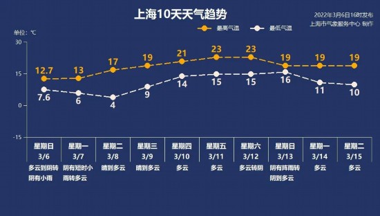 明天(8日)我國大部分降水間歇,上海也將迎來一段晴或多云的天氣。氣溫方面,上海周二(8日)起升溫進入“快速通道”,最低氣溫和最高氣溫一路飆升,溫差也在不斷縮小。周二最低氣溫4℃,周三(9日)最低氣溫9℃,周四(10日)至周日(13日)最低氣溫達到10℃以上,周日最低氣溫16℃。與此同時,周二最高氣溫17℃,周三最高氣溫19℃,周四、周五、周六最高氣溫均超過20℃,周五和周六最高氣溫都是23℃。