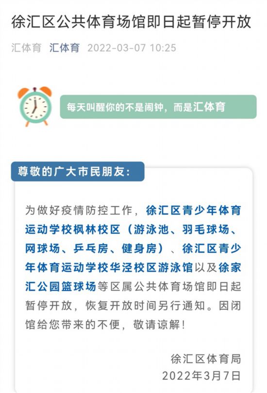 東方網記者劉輝3月7日報道:記者今天從徐匯區體育局官微“匯體育”獲悉,徐匯區公共體育場館今日起暫停開放,恢復開放時間另行通知。原文如下: