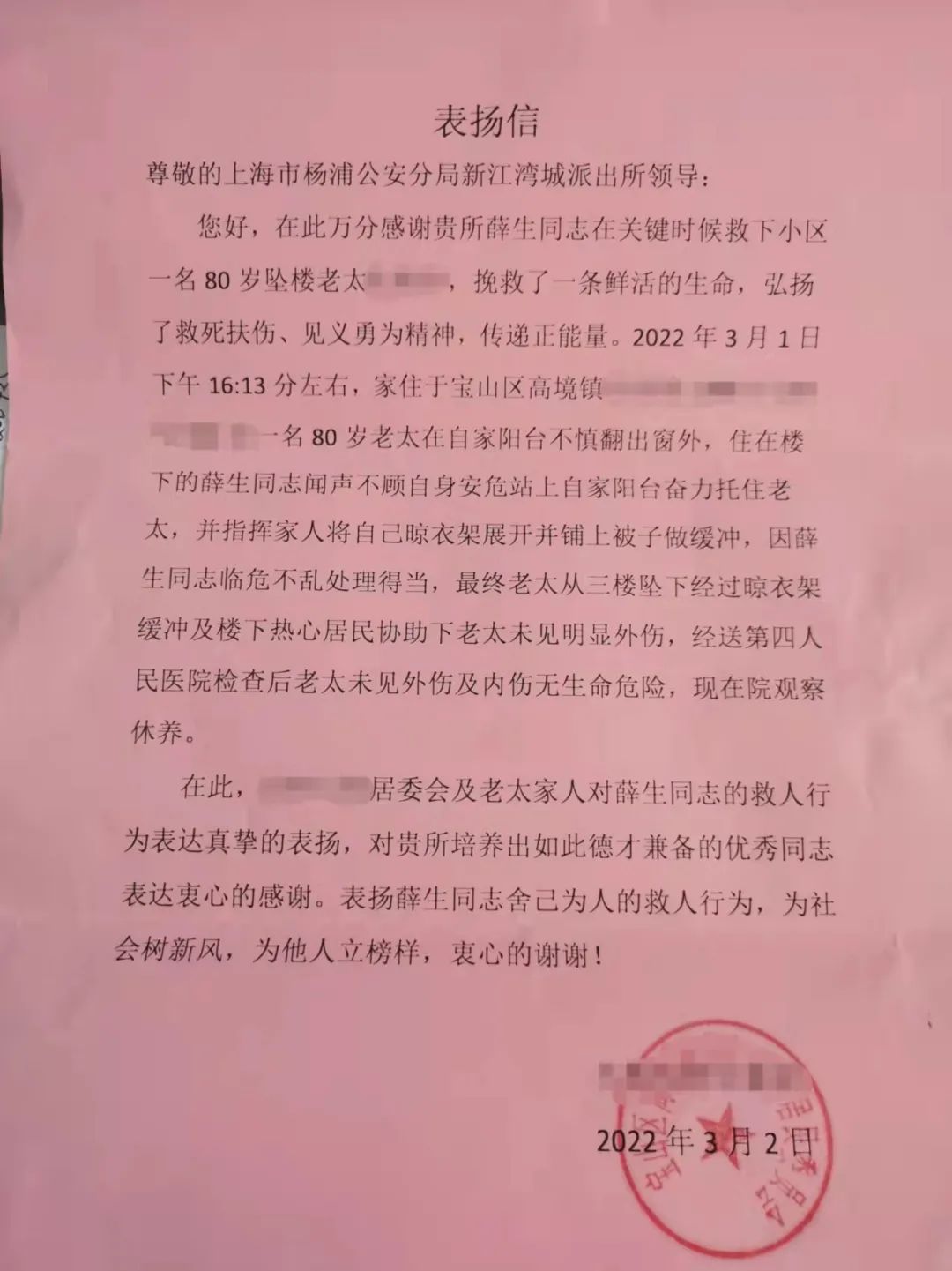 近日,楊浦警方收到一封來自寶山某居委會的表揚信,信中稱,新江灣城派出所民警薛生在非工作時間奮力救助遇險老人,見義勇為。對此,55歲的黨員民警薛生說,這是應該做的事!皬木@些年,處置過各種警情,也救過不少人,雖然不是在崗時間,但任何時間我都是一名民警!