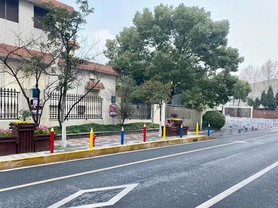 來到明強小學的學校門口,道路旁的紅白欄桿已經全部換成了紅黃藍三色的“鉛筆欄桿”,干凈的街巷增添了一道活潑、明麗的色彩。