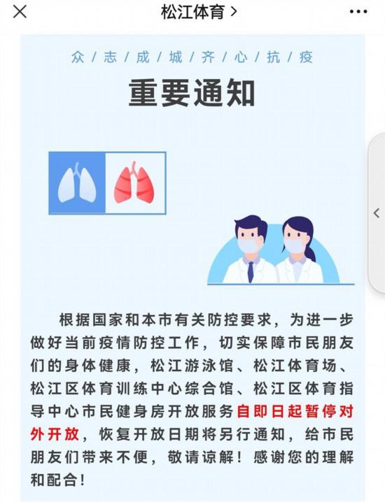 松江體育局官方微信表示:松江游泳館、松江體育場、松江區體育訓練中心綜合館、松江區體育指導中心市民健身房開放服務自即日起暫停對外開放,恢復開放日期將另行通知。
