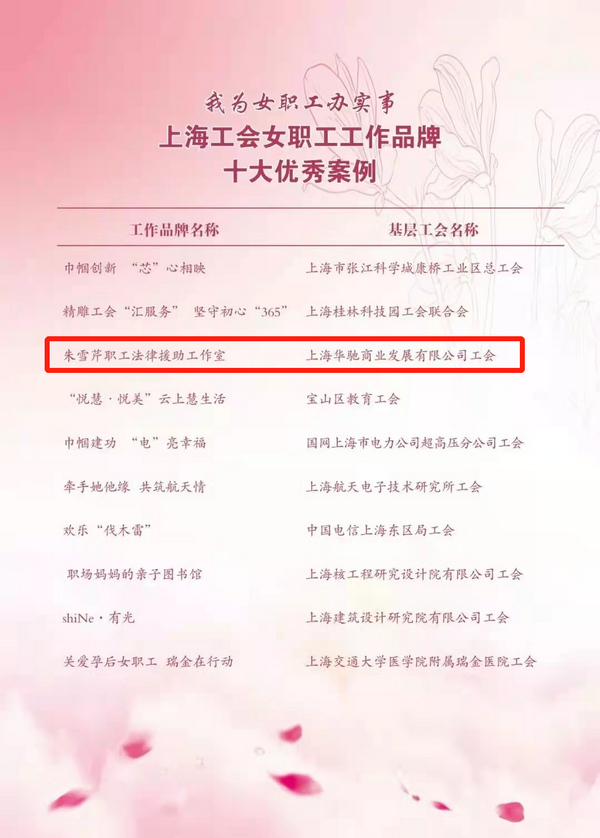 工作室成立以來,接待來電來訪法律咨詢4894件,10747人次,其中外來務工人員3738件、9402人次,提供代書、參與調解協商、代理仲裁訴訟3435件,截至目前,工作室已結案3301件、共挽回經濟損失7100萬余元,其中“誰動了我的奶粉錢”(李某某生育津貼差額案)獲得“全國依法維護婦女兒童權益十大案例”,“孕期女職工的請假審批應從寬處理”獲得“上海工會維護職工權益優秀案例”,接待援助工作真正做到了“零投訴”“零爭議”。2018年工作室榮獲“普陀區社會主義法治文化品牌陣地”稱號,2019年獲“普陀區職工群眾最滿意項目”,2020年獲上海市勞模創新工作室稱號。