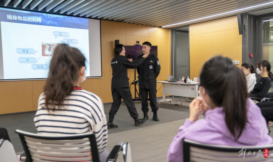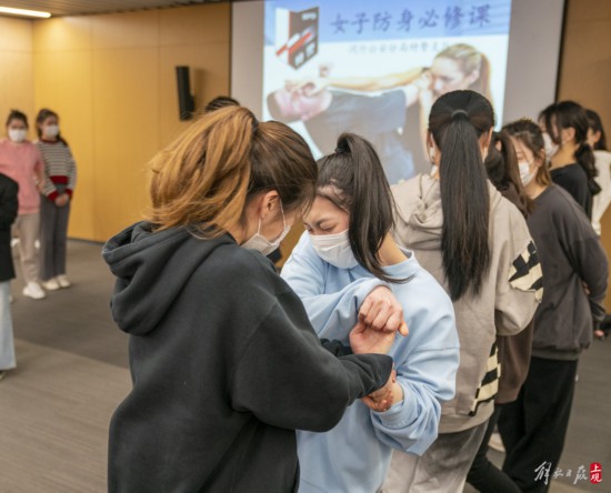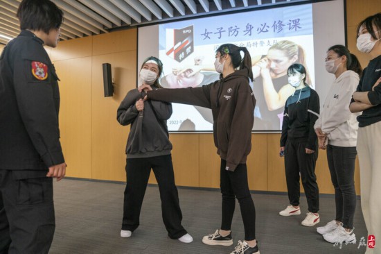 本次“防身必修課”分為三個環節展開,首先是理論課程,通過圖文講解女性應對突發侵犯類情景應當具備的基本處置原則,呼救、擺脫和遠離是教官教授的關鍵詞;第二個環節,兩名教官細致講解了遇到近身侵犯的擺脫動作,并進行了示范;第三個環節,特警教官對女白領們進行了實操訓練。