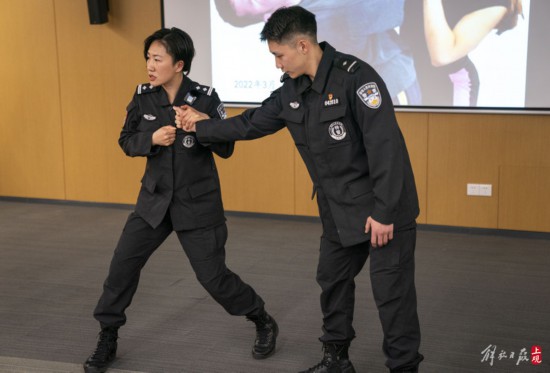 2022年3月8日,閔行區申虹路666弄7號樓的一間會議室里,閔行公安分局特警支隊的女特警丁瑩正與同事張佳峰為周邊工作的女白領們演示如何擺脫近身被束縛的動作要領。