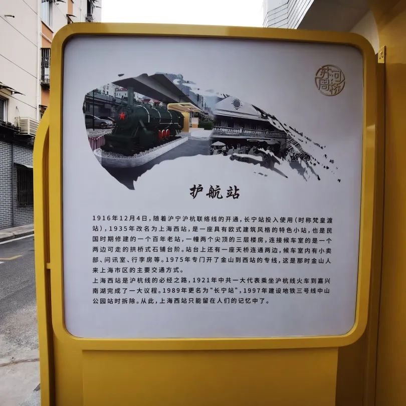 為了重拾這段鐵道歷史,講好周橋故事,在火車亮黃色的“車廂”內,圖文并茂地向過路市民講述護航站的前世今生。車窗上展示著近兩來,街道挖掘蘇州河畔紅色歷史資源而打造的地標建筑,包括護航號、三十七民眾夜校、蘇河驛站。貼心增設的座椅為居住在護航站對面、萬航渡路2032弄的小區居民提供了戶外休憩、談天的空間。