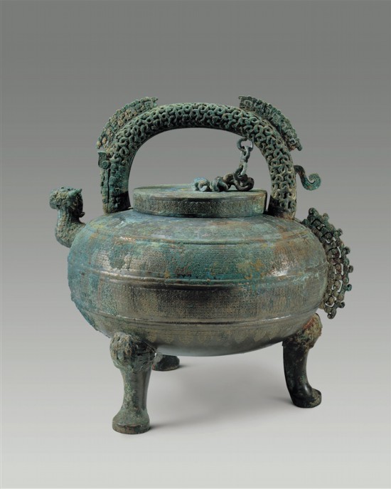 吳王夫差盉(hé)為何鴻章于1996年捐贈,肩部有銘文十二字,內容為:“吳王夫差吳金鑄女子之器吉”,即吳王夫差用青銅為一女子鑄器。夫差在位僅二十三年,目前所見存世遺物多為兵器(劍、矛)和鑒等,以往此盉未見流傳,彌足珍貴。盉的蓋面與器腹紋飾滿布不分首尾極其細密小龍交纏構成的蟠螭紋,與鏤空的提梁相互輝映,形成了華麗縝密的視覺效果。盉的鏤空提梁采用失蠟法澆鑄而成,蓋及器上紋飾運用當時流行的印模技術,體現了當時南方吳越地區(今江浙一帶)的鑄銅工藝。