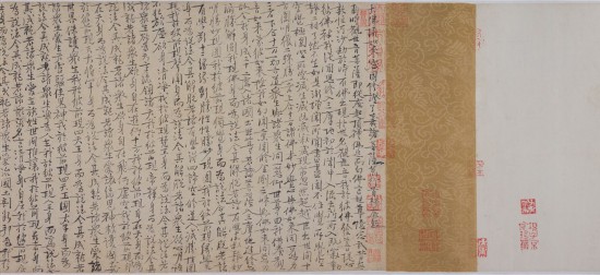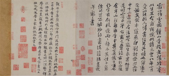 其中,王安石《行書楞嚴經旨要卷》為王南屏、房淑嫣于1985年捐贈,摘錄《楞嚴經》中《觀世音發妙耳門》一節,正書中間有行書,淡墨疾書,筆畫清勁,雖行次緊密,少有空白,然無繚亂之感。其用筆似不經意,卻有閑和蕭散之韻。卷后有南宋牟獻之、元王蒙、明項元汴等人題跋。曾經元陳惟寅、明項元汴、清安岐、曹溶等人收藏。
