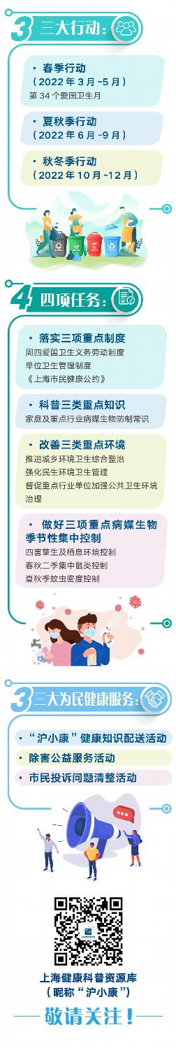 其中,主要有四項任務。一是落實三項重點制度,即周四愛國衛生義務勞動制度,動員群眾清潔家園、維護公共環境,清除衛生死角;堅持落實單位衛生管理制度,組織引導各級各類單位、場所開展內外環境整治和大掃除;堅持推進《上海市民健康公約》,倡導主動健康理念和文明健康綠色環保的生活方式。二是科普三類重要知識,即普及疫情防控及季節性衛生防病知識,采用網絡直播課、健康大講堂、居民健康自管小組等多種宣傳形式,及時準確進行健康知識傳播;開展文明健康綠色環保生活方式的推廣宣傳,引導群眾講衛生、重預防、要健康,養成不扎堆、不隨地吐痰、不亂扔垃圾、使用公筷公勺、不食用野生動物等良好習慣;開設病媒生物等專業防控知識的線上課程。三是改善三類重點環境,即開展民生環境的衛生治理,著力解決老舊小區、農貿市場和“三小”行業等場所存在的衛生頑疾;督促重點單位提高衛生管理水平,加強清掃保潔和消毒頻次,做好病媒生物預防控制;持續推進城鄉環境衛生綜合整治,聚焦“五清一改”(清垃圾、清搭建、清雜物、清堆物、清張貼、改習慣)。四是做好三項重點病媒生物季節性控制,即做好孳生場所控制,動員社區單位開展衛生大掃除,翻缸倒罐、疏通溝渠,清除衛生死角和室內、庭院積水,鏟除蚊蠅孳生環境和鼠類棲息場所;做好蚊蟲控制,推動監測系統接入“一網統管”平臺,持續落實越冬、早春和夏秋季蚊蟲專項控制措施;做好鼠類控制,結合疾控部門春秋季滅鼠前鼠情調查情況,以本市原流行性出血熱高發地區及病原學監測陽性地區和各類商業綜合體、集貿市場、餐飲場所及其周邊居住區等區域為重點,組織專業防制人員統一開展春秋季滅鼠活動。
