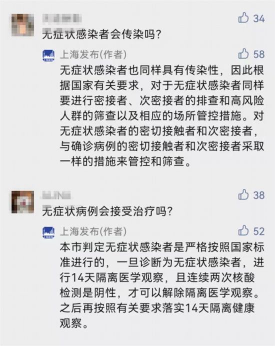 上海發布回復:無癥狀感染者也同樣具有傳染性,因此根據國家有關要求,對于無癥狀感染者同樣要進行密接者、次密接者的排查和高風險人群的篩查以及相應的場所管控措施。對無癥狀感染者的密切接觸者和次密接者,與確診病例的密切接觸者和次密接者采取一樣的措施來管控和篩查。