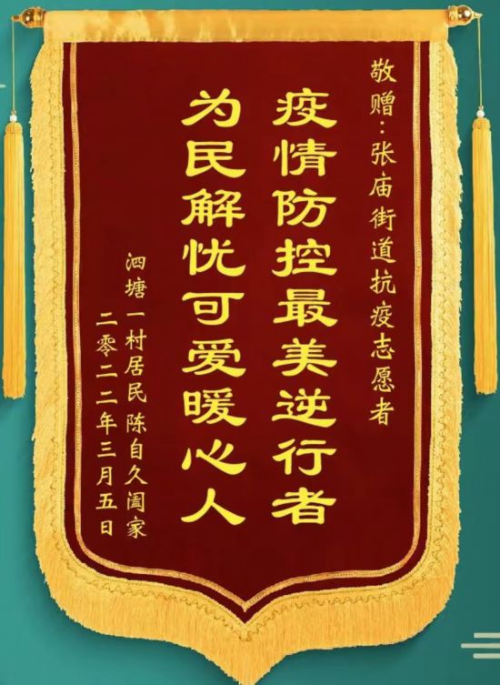 3月6日,在寶山張廟街道的泗塘某村實行封閉管控的第三天,街道就收到了居民送來的一面錦旗“疫情防控最美逆行者、為民解憂可愛暖心人”。這是小區居民群眾對封控一線工作者的最高褒獎。