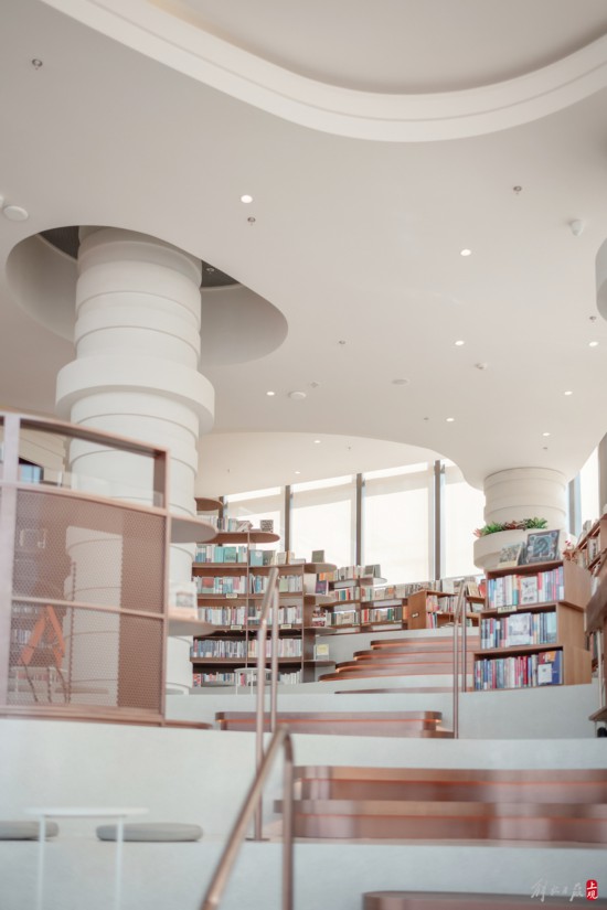 挑高的設計給書店帶來立體的空間,讀者可以在臺階上隨意就座,閱讀飲茶。