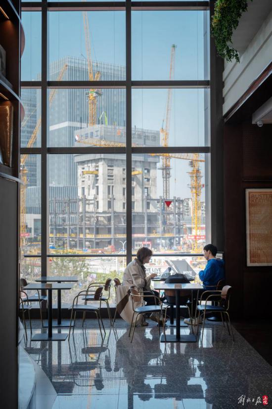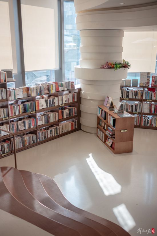 走進書店最為令人印象深刻的莫過于巨大的落地玻璃窗。窗外,前灘和世博文化公園的南區正如火如荼地建設中。
