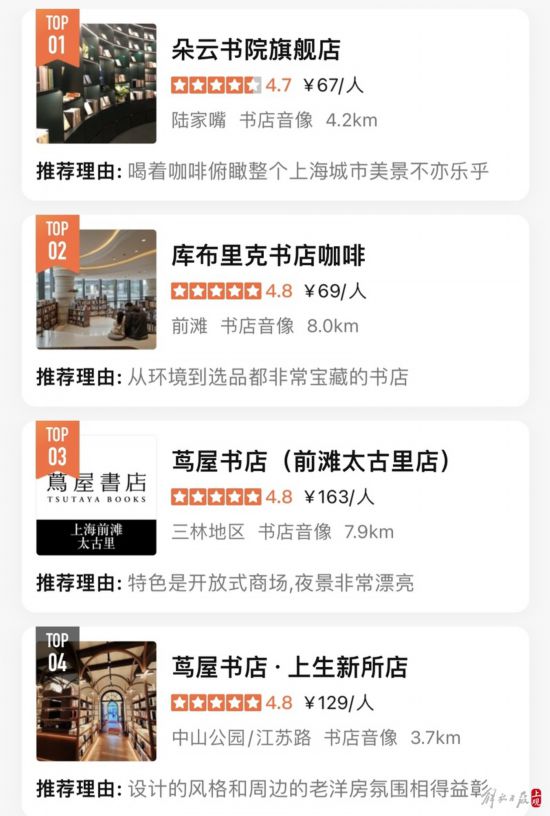 最近,在某點評類生活服務平臺上,一家同樣開在前灘太古里的書店竟位居“上海書店音像熱門榜”第二,以一名之差壓蔦屋書店一頭。