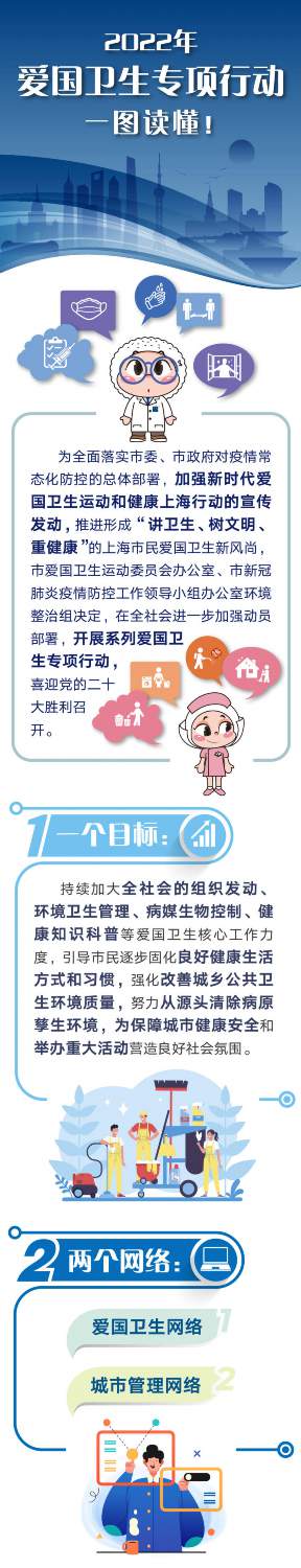 為全面落實市委、市政府對疫情常態化防控的總體部署,加強新時代愛國衛生運動和健康上海行動的宣傳發動,推進形成“講衛生、樹文明、重健康”的上海市民愛國衛生新風尚,市愛國衛生運動委員會辦公室、市新冠肺炎疫情防控工作領導小組辦公室環境整治組將在全社會進一步加強動員部署,通過三大行動貫穿全年、四項任務全面出擊、三個重點精準觸達,開展系列愛國衛生專項行動。