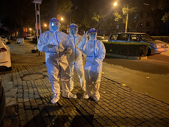 3月8日凌晨1時,金山區朱涇鎮疫情防控指揮部接到區疾控通知,臨倉街有密接人員,鎮疫情防控指揮部工作人員趙俊軼、戈亞平第一時間前往現場,與居委會一起核對整棟樓的居民名單,對出入過樓棟的人員進行摸排召回;對密接、次密接人員進行電話告知在家等待,不要出門,囑咐準備好個人生活用品,等待轉運。同時,聯系民警對樓棟進行封控,通知社區醫生進行核酸檢測和環境采樣。等整個環節結束,120閉環將密接、次密接人員送至集中隔離觀察點,已是早晨6時。趙俊軼、戈亞平沒有回家休息,而是又匆忙趕回了單位。