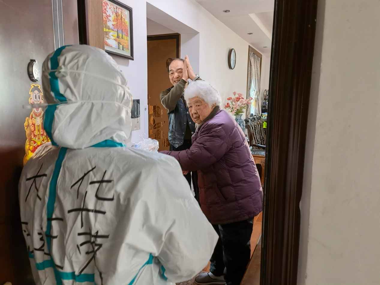 大場鎮某小區的“大白”給行動不便的老人送物資。工作人員供圖