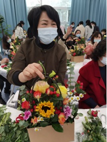 在“花樣幸!被顒蝇F場春意盎然、花香四溢,姐妹們在老師的指導下相互討論、借鑒,享受著DIY創作的樂趣。一花一草經過修剪、層層搭配,變成了一件件錯落有致、獨具匠心的花卉作品。